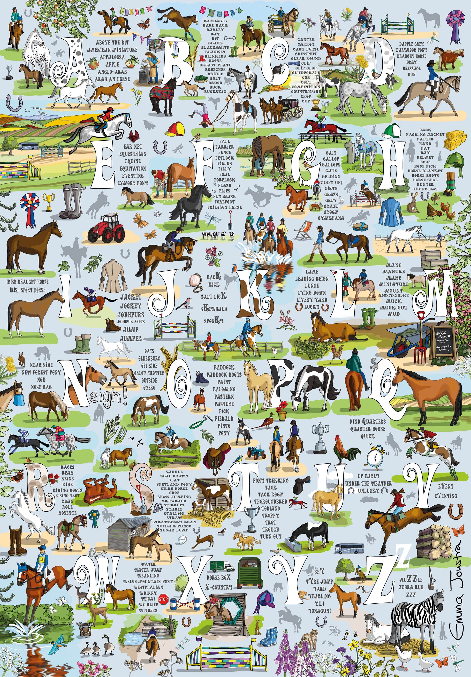 This is a beautiful illustration the Horse and Pony A to Z, one for the lover of horse and ponies, their different breeds. Illustrated by Stone based artist Emma Joustra.