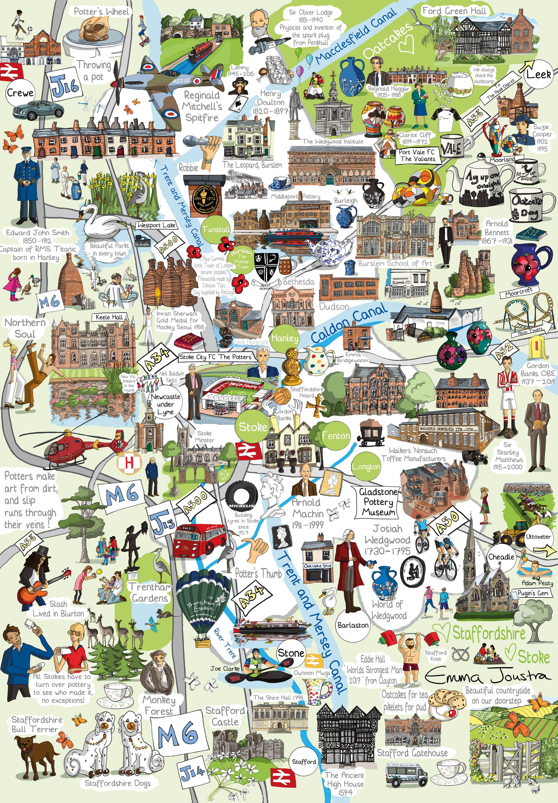This is a beautiful illustration of the six towns which make up the potteries has been produced by Stone base artist Emma Joustra.