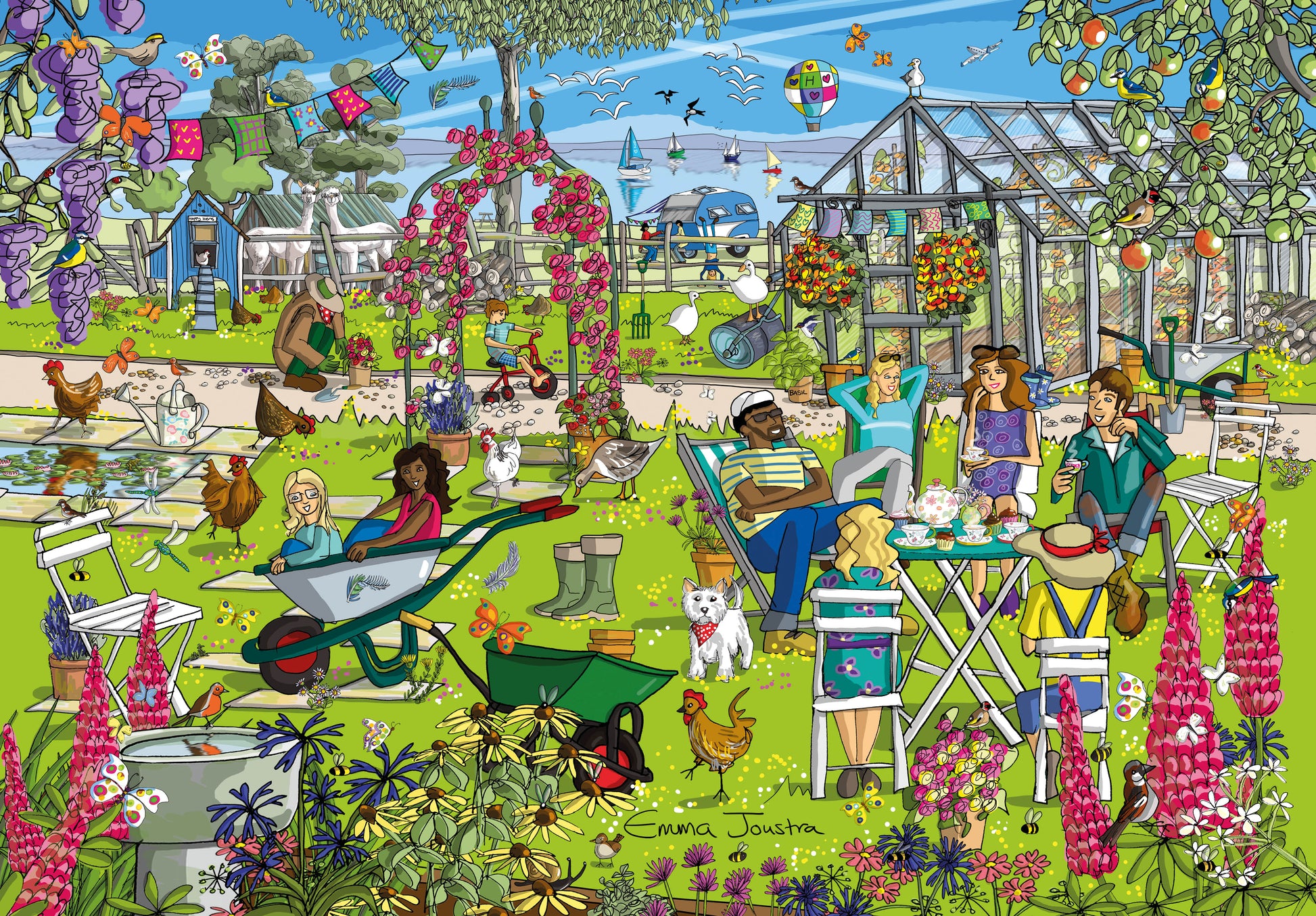 Taking a moment to relax in the garden with afternoon tea, whilst children play, birds sing and bees buzz all around. This illustration has been produced by Stone based artist Emma Joustra.